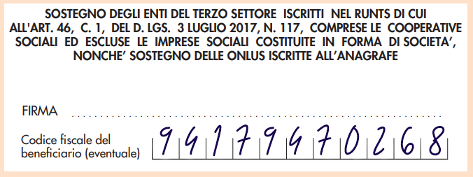 teniamo a ricordarvi che la nostra Associazione beneficia del 5×1.000 per cui potete destinare nella vostra prossima dichiarazione dei redditi nell’apposito riquadro, qui di seguito riportato in fac-simile, tale preferenza a favore della medesima ponendo la vostra firma e inserendo il codice fiscale.