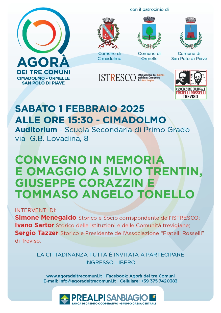 La nostra Associazione Civica “AGORA’ DEI TRE COMUNI “, nell’ambito delle varie iniziative in corso che ricordano l’avvento 100 anni fa della  dittatura con l’istituzione dello Stato fascista, è lieta di aprire l’attività per il  nuovo anno dedicando un Convegno in memoria e omaggio a Silvio  Trentin, a 140 anni dalla nascita, a Giuseppe Corazzin, nel centenario dalla  nascita e a Tommaso Angelo Tonello, a 60 anni dalla morte, tre esponenti  di spicco della nostra Provincia con diverso orientamento politico che si  opposero al regime fascista e furono per questo perseguitati.